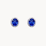 Beautifully crafted earrings in 18 kt solid white gold.  The oval sapphires are surrounded by a dazzling halo of diamonds.