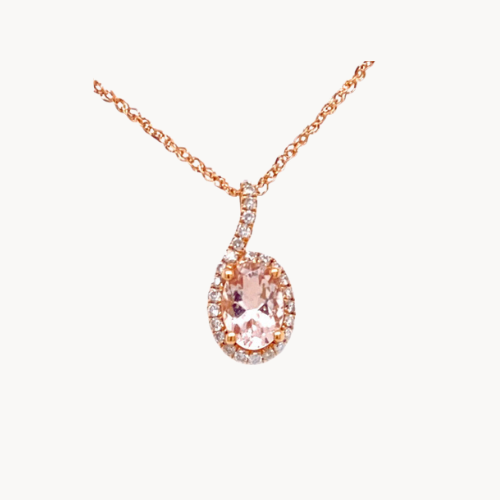 Brilliantly crafted in 14k rose gold, this morganite diamond pendant evokes sophistication. A stunning oval morganite is held in a diamond encrusted swirl motif. The peach hue of the morganite is beautifully complemented by the diamond accents.