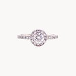 This modern halo style ring features a natural Canadian diamond set with a diamond halo and diamond accented band. Handcrafted in 14K this delicate ring is the perfect choice.