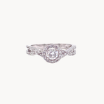 This modern halo style ring features a natural diamond set with a diamond halo and a diamond accented band. Handcrafted in 14K this delicate ring is the perfect choice.