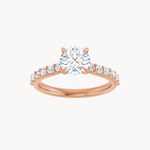 This stunning ring features a single natural diamond set in a classic four prong setting on a thin diamond accented band. Handcrafted in 14K rose gold this delicate ring is the perfect choice.